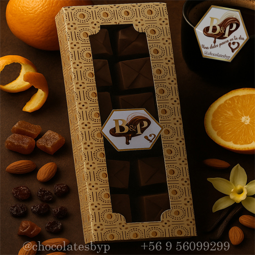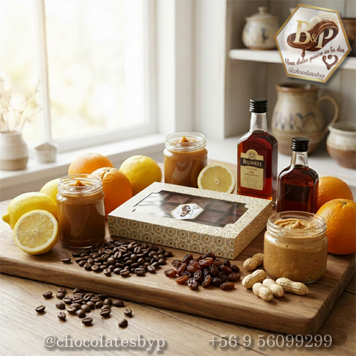 Nuestra caja surtida de 12 bombones gourmet reúne en un solo empaque una selección magistral de sabores: café intenso, manjar cremoso, almendra crocante, pasas maceradas al ron, notas frescas de limón y naranja natural.